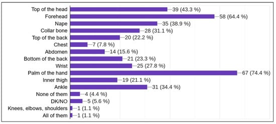 Regarding the main questions of this survey, oriented to the use of biological sensors, 97.8% of respondents agreed about the usefulness of monitoring their physical and mental state while on duty. In the question about the most interesting factors to analyze using these sensors, the most selected items were stress (72.5%), fatigue (78%), heart rate (76.9%) and body temperature (67%). A complete set of results is shown in Figure 13. Most of the firefighters surveyed were willing to be part of an experiment with biosensors while on duty (91.3%). Finally, when asked about where not to attach sensors, their main answers were the forehead (65.2%) and the palm of the hand (75%). All the results to this question can be seen in Figure 14.