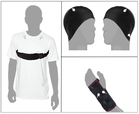 Proposal of integrated-sensor garment. Clockwise, starting from left: T-shirt with ECG and PZT sensors, integrated-EEG-sensor cap and wristband with integrated EDA sensors.
