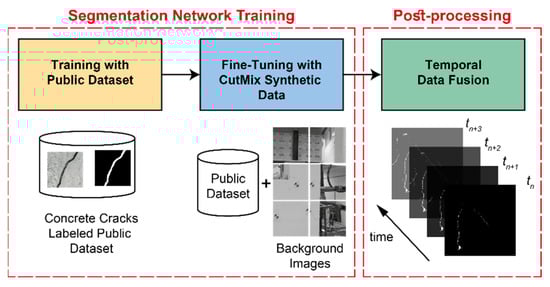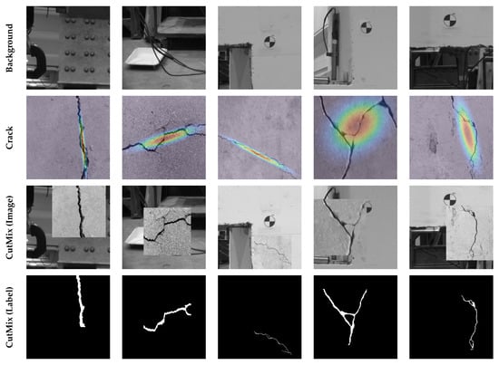 A more efficient solution is to pre-train segmentation networks with the available crack datasets and use synthesized crack images for fine-tuning the network. The synthesized crack images should include the unique features that appear in an actual image. In a method called CutMix, a random patch from one image in the dataset is cropped and pasted onto another image to generate a dataset that resembles real conditions. This method was first introduced by Yun et al. [