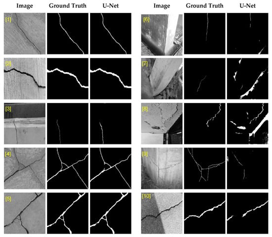 39], can be employed to find the key points on the structure. Overall, it is illustrated that the proposed techniques can improve the F1-score and mIoU of the crack segmentation of U-Net from 0.5113 and 0.4888 to 0.6564 and 0.5975, i.e., by 28.4% and 22.2%, respectively. Meanwhile, MCC increases from 0.0541 to 0.2831, which is a remarkable improvement for this accuracy metric. The achieved accuracy metrics are still below the case when U-Net is tested with a dataset similar to its training dataset. However, applying the proposed improvements can boost the performance of the network significantly.