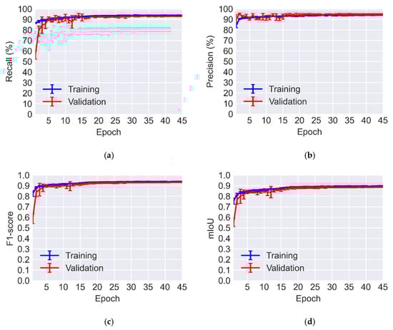 Figure 10 confirms that for most cycles the recall decreases. Nonetheless, the F1-score, mIoU, and MCC have an increase of up to 0.17, 0.14, and 0.27, with an average gain of 0.07, 0.06, and 0.08, respectively.