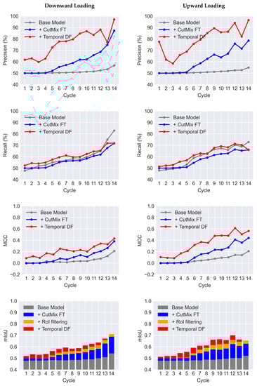 Figure 10, the improvement in precision becomes more pronounced for the later cycles of the experiment in such a way that for Cycle 14 of downward loading it jumps from 56.76% to 87.26%. The recall, however, has a slight 2% average reduction.