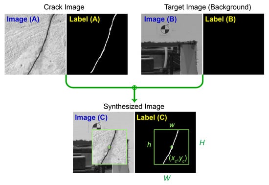 Figure 11, in this technique a pair of images are randomly selected. One image is a crack image, i.e., Image (A), drawn from the public dataset with its corresponding label. The other image, i.e., Image (B), is from a scene of the target structure when cracks are not initiated yet, therefore, its label, i.e., Label (B), contains no crack pixels. In this way, all pixels in Image (B) can be labeled as background. Here, both images have equal dimensions of 512 × 512 pixels. To combine these two images, a rectangular patch with the center at coordinates