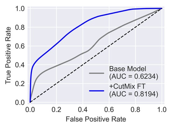 Figure 13, the ROC curve for the Base Model is compared with that of the model trained with CutMix synthesized data. Poor performance of the Base model when evaluated with the target dataset is evident by the fact that its ROC curve is closer to the diagonal line. Meanwhile, the model trained with CutMix data is relatively more skillful in separating crack pixels from background pixels. As a result, this model has an AUC equal to 0.8194 which, compared to the AUC of the Base Model equal to 0.6234, is a significant improvement.