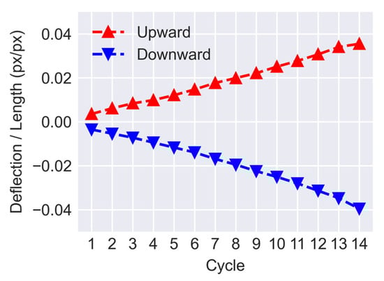 Figure 16 displays the ratio of the beam’s deflection over its length for cycles 1 to 14. The displacements and lengths are measured in the pixel domain using the position of the circular markers attached to the specimen. As can be seen, for both downward and upward loadings the deflection ratio of the beam is approximately changing linearly over time with an average difference of 0.003 between each consecutive cycle. A large interval between cycles can affect the outcome of crack mask transformations. Typically transformed masks of further steps have more misalignment errors when compared with the current step. That is due to larger deformations of the structural elements and the relative out-of-plane motion of the markers. The effect of such errors can be reduced by either using shorter intervals or more markers which can result in a finer mesh and a more accurate transformation.