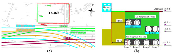 The plane (a) and section (b) positional relationships of the theater and the metro lines.