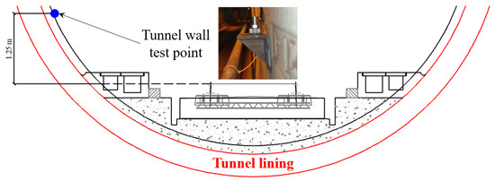 The measurement of the in-track vibration indicates the vibration intensity of the excitation source. According to the technical guidelines for environmental impact assessment—urban rail transit (HJ 453-2018 [45])—to assess the excitation source vibration intensity, the recommended test position for underground metro lines is on the tunnel wall with 1.25 m above the rail surface, as shown in Figure 2.