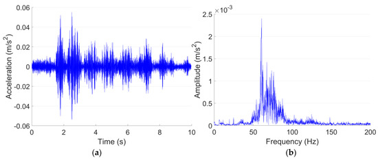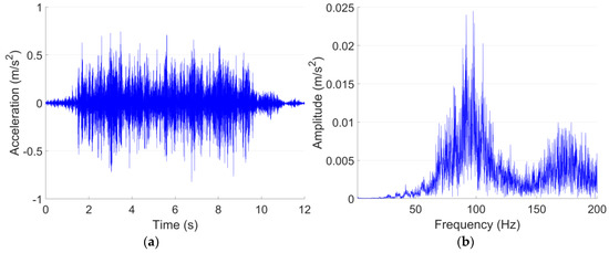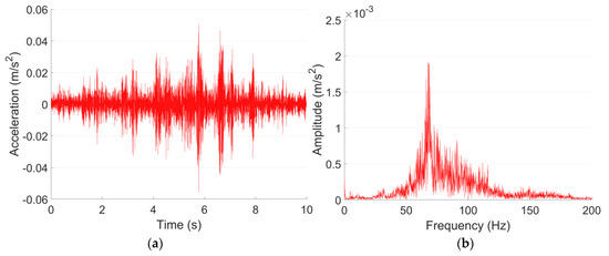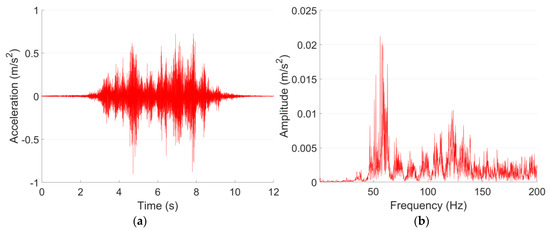 Typical tunnel wall acceleration responses in time (a) and frequency (b) domain in Line B.
