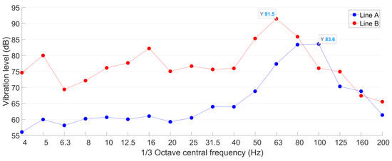 It can be seen from Figure 5 that the vibration acceleration level of Line B is in general higher than that of Line A. The VLmax of Line B is 92 dB, which is 8 dB higher than that of Line A. The 1/3 octave frequency bands corresponding to the VLmax are 100 Hz in Line A and 63 Hz in Line B, which are consistent with the dominant frequencies of both lines (Figure 3b and Figure 4b). Such results indicate the high correlation between these two expression forms of vibration.