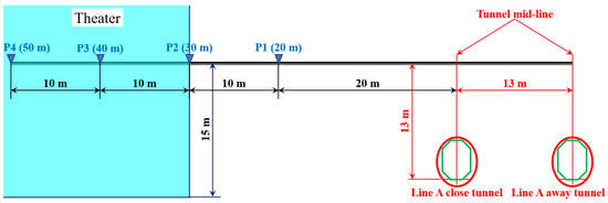 The ground vibration test points are set-up along the direction perpendicular to the metro lines, as demonstrated in Figure 6. The horizontal distances of the test points P1–P4 from the mid-line of the Line A tunnel are 20–50 m with intervals of 10 m.