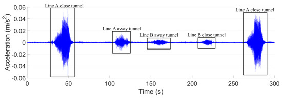 The ground vibration measurements are performed with continuous sampling, and the responses corresponding to trains are recognized by the train records in the metro stations. A short period of typical time-domain ground vibration responses obtained from test point P1 (Figure 6) is shown in Figure 7. The corresponded tunnels of the vibration sources are marked.