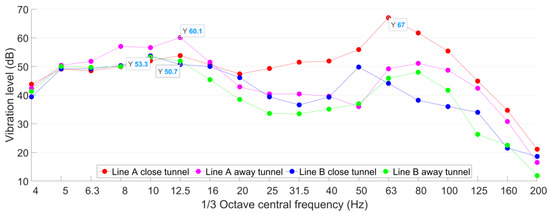 The VLmax induced by the train from the Line A close tunnel is 67 dB with the corresponded frequency band of 63 Hz. Such a result is 7 dB higher than that of Line A away tunnel, and more than 13 dB higher than those of Line B tunnels. It has to be noted that in the frequency range of 6.3–16 Hz, the vibration responses due to the trains from the Line A away tunnel are higher than those from the Line A close tunnel, which is likely caused by the interference of the metro tunnel (Line A close tunnel) on the vibration propagation.