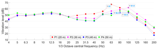 It can be seen from Figure 9 that the VLmax attenuated from 67 dB in the test point P1 to 62 dB in P2 and further decreased to 54 dB and 56 dB in P3 and P4, respectively. In the frequency range of 4–20 Hz, the vibration levels are relatively stable and did not decrease with the increase of metro distance. In the test point P4, the vibration levels in 4–20 Hz are even higher than those in P1–P3. In terms of an existing building, the vibration acceleration level of P2 represents the impact of train-induced ground vibration on the building [45]. Considering that the metro-train-induced ground vibration has no noticeable fluctuation between daytime and nighttime; the vibration acceleration level of P2 is already equal to the nighttime limit (62 dB, Section 3.4).