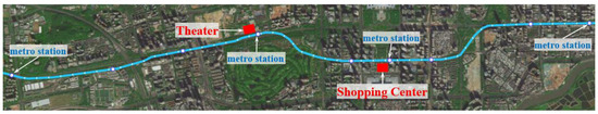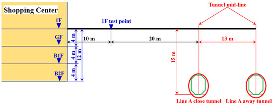 To ensure the reliability of analogical assessment results, the train-induced vibration in the shopping center is validated using the ground vibration results from the construction site of the theater. The vibration validation test point is setup on the first floor (1F) out of the shopping center, and the horizontal distance from the Line A close tunnel is around 20 m, as shown in Figure 11. The mutual position relationship between the shopping center and Metro Line A is shown in Figure 12.