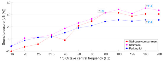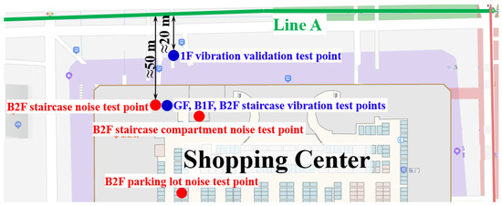 It is shown in the vibration measurement results that the worst vibration situation appears in B2F. Therefore, the noise test points in the public area are set-up in B2F. Specifically, one test point in the staircase compartment (fully enclosed space, dimension = 8 × 12 × 4 m3, 60 m from Line A), one test point in the staircase (half enclosed space, dimension = 7 × 13 × 2 m3, 50 m from Line A) and one test point in the parking lot (open space, height = 4 m, 110 m from Line A), as shown in Figure 11.