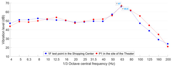 Figure 13 and Figure 14 indicate that the Line A metro train-induced ground vibration responses in both test points in 1F in the shopping center and P1 in the site of the theater are quite close to each other. The maximum accelerations in both test points are around 0.05 m/s2, and the dominant frequencies are both around 60 Hz. The comparison of the 1/3 octave frequency division vibration acceleration level of both test points is given in Figure 15.