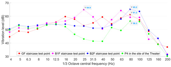 The results of test point P4 on the site of the theater are distributed in Figure 17 as well. It can be seen that the vibration responses in the staircase are much higher than that in test point P4 in the construction site of the theater. Such results indicate that the train-induced vibration can propagate father in the structure due to the lack of damping soil. It can be concluded that the expected train-induced vibration in the public area will be 5–9 dB higher than the current ground vibration.