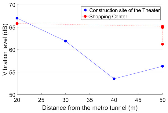 The developments of the vibration level with the horizontal distance from the metro tunnel in both the construction site of the theater and the shopping center are presented in Figure 18. In the construction site of the theater, the vibration level dramatically decreased with the increase of the horizontal distance from the metro tunnel. In the shopping center, the attenuation is rather limited due to the lack of damping soil.