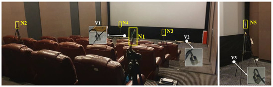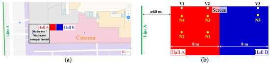 In the measurements in the cinema, two vibration test points (V1 and V2) and four noise test points (N1–N4) are set up in Hall A, one vibration test point (V3) and one noise test point (N5) are set up in Hall B, as demonstrated in Figure 20b and Figure 21. The shortest horizontal distance from Hall A to the metro tunnel is around 60 m, and the width of each hall is 8 m. To avoid the influence of the carpet on the vibration measurement, the accelerometers are set up under the screen in B2F. To better analyze the train-induced radiated noise in the cinema hall, all the main acoustic sources including the air conditioner and broadcast are turned off during the measurements.