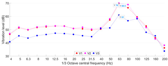 The vibration acceleration levels obtained from the test points in the cinema are presented in Figure 22. It can be seen that the responses of the two vibration test points in Hall A are consistent with each other. The VLmax is 70 dB and the corresponded frequency band is 63 Hz. Since both test points V1 and V2 are set up on the same beam, the measured vibration responses to some extent represent the vibration of the beam. It has to be noted that although the test points in Hall A in the cinema are more than 10 m farther from the Line A tunnel than those in the staircase, the VLmax in Hall A is more than 5 dB higher than that in the B2F staircase test point and 8 dB higher than the allowable level in the theater. Such results indicate that the cinema hall with a larger space is not good for the attenuation of train-induced vibration.