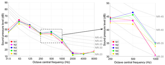 where is the allowable sound pressure level in each frequency band, A and B are constant values that correspond to each frequency band [41], and NR is the sound pressure level in the frequency range of 1000 Hz.