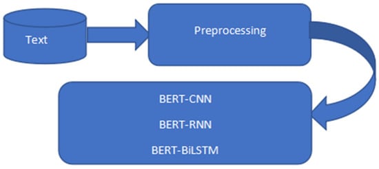 Chiorrini et al. [] proposed two BERT-based approaches for text classification: BERT-base and cased BERT-base. They gathered information from microblogging sites, particularly twitter. Two separate datasets were employed in their experiment, and they were used for sentiment analysis and emotion recognition. The proposed model gives an accuracy of 92%. They emphasized that BERT produces positive outcomes for text classification.