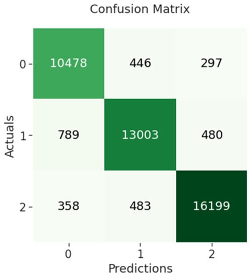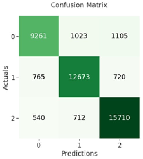 The confusion matrix of BiLSTM indicates that 9847 out of 11,221 negative sentiments were correctly classified, while 12,816 out of 14,272 neutral sentiments were correctly classified and 15,700 out of 17,040 positive sentiments were correctly classified as shown in Figure 6 below.