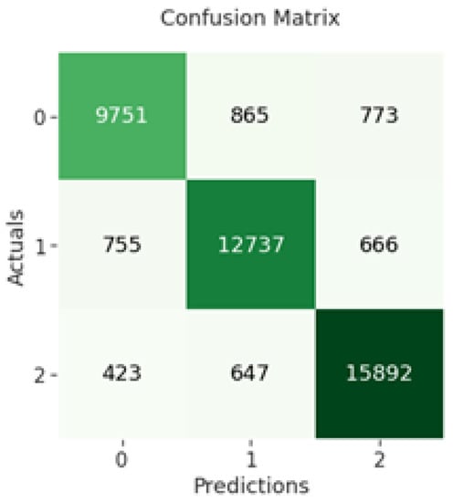 The confusion matrix of CNN indicates that 9751 out of 11,389 negative sentiments were correctly classified, while 12,737 out of 14,158 neutral sentiments were correctly classified and 15,892 out of 16,962 positive sentiments were correctly classified as shown in Figure 5 below.
