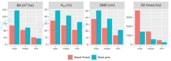 The analysis is based on 24, 15-m-radius, circular forest plots located within the study area: 12 in mature European beech (Fagus sylvatica L.) stands, 12 in mature black pine (Pinus nigra subsp. laricio Maire) stands. Diameters at breast height and a sample of the heights of the trees were measured in all plots. For further details on this dataset, please see [13,20]. Figure 2 presents statistics of plot-level characteristics by forest species. Field basic data are available at http://doi.org/10.5281/zenodo.3575529 [25].