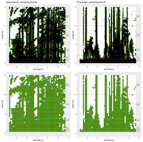 Vertical slice of the TLS–3D space surrounding two example plots. The slice is 10 voxels thick, cut along the central line. Black dots in the upper graphs are cloud points, while in the lower ones, only vegetated voxels are displayed. Voxels (0.5 × 0.5 × 0.25 m) are considered “vegetation” (green) if they contain at least five points. Point cloud is clipped at a height of 0.5 m (to avoid effects from ground vegetation) and 15.5 m (due to the working range of the mobile–TLS). Horizontal dashed lines mark layers’ limits: (FF) forest floor (0.5–1 m), (Sh) shrubs (1–2 m), (LU) lower understory (2–5 m), (UU) upper understory (5–10 m), (Sc) subcanopy (10–15.5 m).