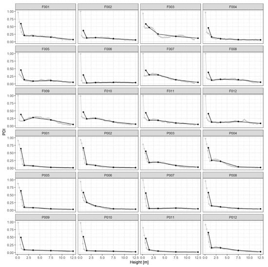 Vertical profiles of the Plant Vegetation Index (PDI), by plot, for all 24 stands. Grey dots are voxel high (0.5 m) slices averages. Black dots refer to PDI average values by height class, from left to right, they represent: FF—forest floor, Sh—shrubs, LU—lower understory, UU—upper understory, Sc—subcanopy.