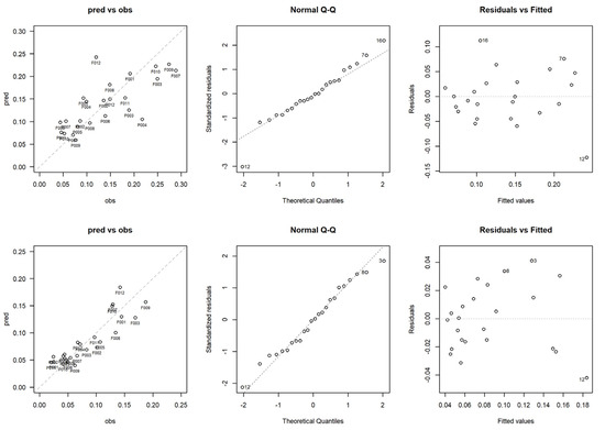 Figure 5 shows scatter plots of the observed TLS-based versus the ALS-based predicted variables, together with the residual analysis, for both lower (LU) and upper (UU) understory. LU residuals are relatively uniformly distributed, except for two extreme values. UU residuals are much closer to the zero line but display a possible unexplained curvature.