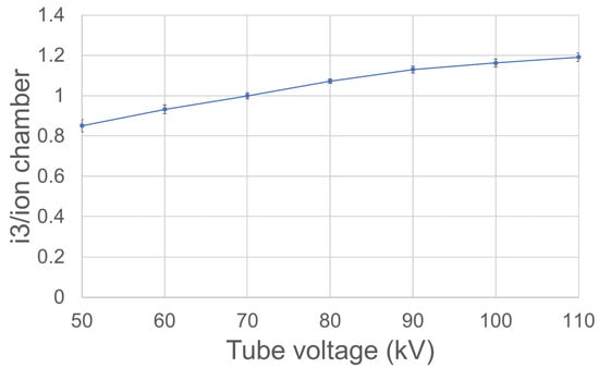 In terms of tube-voltage dependency, the lower the tube voltage, the slightly lower the i3 value. However, if the ratio of the values measured at 70 kV was set to 1, the difference between the 50 and 110 kV values was <±20%, thus well within the ±25% range of the Raysafe instruction manual [25].
