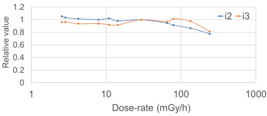 Figure 7 shows the dose-rate dependencies. The dose per hour is shown on the horizontal axis, and the ionization-chamber dosimeter reading divided by those of the i2 or i3 is shown on the vertical axis. At low dose rates, the i2 and i3 responses were similar. At very high dose rates (250 mGy/h), both the i2 and i3 evidenced dose-rate dependency (~20%).