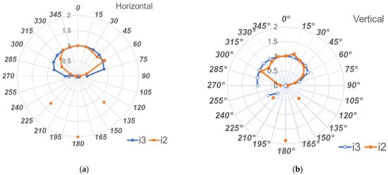 Angle dependencies of the i3 and i2 sensors: (a) Horizontal plane; (b) Vertical plane.