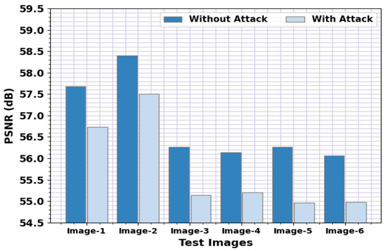 PSNR analysis of the PPIE-ODLASC system under with and without attacks.