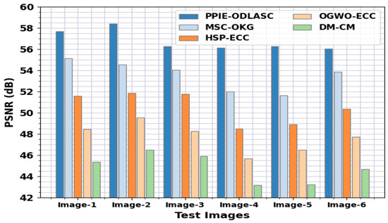 A comparative PSNR study of the PPIE-ODLASC approach with other existing methods on various images is given in Table 4 and Figure 6. The outcome highlighted that the PPIE-ODLASC system reached higher PSNR values. For instance, in image1, the PPIE-ODLASC methodology obtained an improved PSNR of 57.68 dB, while the MSC-OKG, HSP-ECC, OGWO-ECC, and DM-CM models obtained a reduced PSNR of 55.14 dB, 51.60 dB, 48.45 dB, and 45.37 dB, respectively. Similarly, in image 3, the PPIE-ODLASC model reached an improved PSNR of 56.26 dB, while the MSC-OKG, HSP-ECC, OGWO-ECC, and DM-CM [33] models obtained a reduced PSNR of 54.02 dB, 51.77 dB, 48.26 dB, and 45.88 dB, correspondingly. Additionally, in image 6, the PPIE-ODLASC model obtained an improved PSNR of 56.06 dB, while the MSC-OKG, HSP-ECC, OGWO-ECC, and DM-CM models obtained a reduced PSNR of 53.86 dB, 50.36 dB, 47.72 dB, and 44.69 dB, correspondingly.