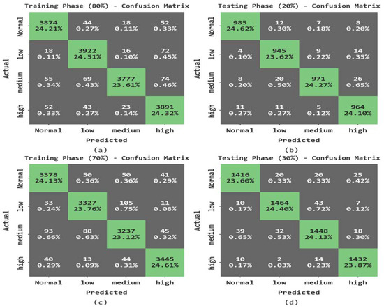 Confusion matrices of the PPIE-ODLASC approach; (a,b) TR and TS databases of 80:20 and (c,d) TR and TS databases of 70:30.