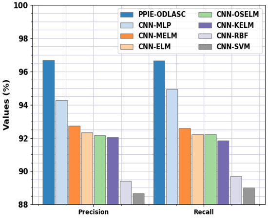 Simultaneously, based on , the PPIE-ODLASC technique has gained increased values of 96.65%, while the CNN-MLP, CNN-MELM, CNN-ELM, CNN-OSELM, CNN-KELM, CNN-RBF, and CNN-SVM models have reported reduced values of 94.60%, 92.60%, 92.20%, 92.13%, 91.84%, 90.10%, and 88.66%, respectively.