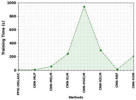 Finally, a detailed training time (TRT) inspection of the PPIE-ODLASC with other DL methods takes place in Figure 14. The results implied that the PPIE-ODLASC approach has gained better performance with a minimal TRT of 4.39 s. Contrastingly, the CNN-MLP, CNN-MELM, CNN-ELM, CNN-OSELM, CNN-KELM, CNN-RBF, and CNN-SVM models have reported increased TRT of 94.28%, 92.73%, 92.33%, 92.16%, 92.05%, 89.40%, and 88.66%, respectively. The result shows the superior performance of the PPIE-ODLASC approach over other existing techniques.