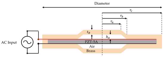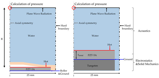Three physical models were applied to the finite element analysis model. Electrostatics induce a piezoelectric effect by forming an electric field generated by the electrical input in the PZT. In solid mechanics, the thickness mode vibration of PZT is analyzed by the electrostatic force generated by the piezoelectric effect. The movement of the PZT acted as a displacement on the metal cap and vibrated in the bending mode. Finally, the acoustic method was used to calculate the sound pressure caused by the vibration of the metal cap. Cymbal transducers typically use cylindrical PZT disks and metal caps. Therefore, they were modeled with an axial symmetry condition, and boundary conditions, such as a hard boundary, to simulate the array and plane wave radiation for far-field applications were utilized. Because the cymbal transducer has a symmetrical structure in the upper and lower layers, the roller condition was applied to reduce the amount of analysis. The PZT material used was PZT-5A (PZT-5A, Piezo.com, Division of Mide Technology, Woburn, MA, USA), and the metal cap was brass. Because it is an underwater ultrasonic transducer, the medium is water, and the length R of the medium is 1 m for calculating the transmitting voltage response (TVR). Five parameters were used in the design of the cymbal transducer: : thickness of the metal cap, : height of the air layer, : radius of the metal cap, : radius of the cavity base, and : total radius represent the radii of the transducer, limited to half the pitch (=1/4 of the wavelength). Therefore, parameter sweeps were performed for tm, , , and .