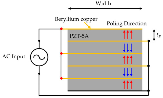 Piezoelectric materials generally vibrate in the thickness mode, and the frequency is mainly determined by the thickness. The lower the frequency, the longer the wavelength; thus, the thickness of the piezoelectric material increases. However, it is challenging to fabricate PZT at the centimeter level. To compensate for this, stacked piezoelectric transducers have been proposed [22]. In the PZT-5A stack process, a low-viscosity epoxy (Epo®-Tek 301, Epoxy Technology, Billerica, MA, USA) was used to minimize its influence on the vibration mode of PZT. An electrode was placed between the PZT and epoxy to maintain the electric field force while stacking the piezoelectric material. Changing the poling direction of the PZT according to the order of the hot ground is advantageous for improving sensitivity (Figure 5). is the thickness of the single PZT.