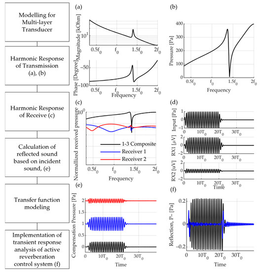 Algorithm of analytical model for active reflection control. (a) Electrical impedance; (b) harmonic response of transmitter; (c) harmonic response of receiver; (d) time domain analysis of reception sensitivity according to unit pressure input; (e) compensation pressure for reflection control; (f) reflection pressure with only passive attenuation (black) and with active reflection control applied (blue).