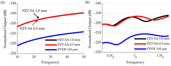 The main performance indicators of the receiver are the receiver sensitivity, bandwidth, and effect on the transmitted sound. PZT-5A 1.0 mm and 0.5 mm and PVDF 110 μm to be used as receiving sensors all show center frequencies at high frequencies. It is difficult to compare the bandwidths because they operate in the non-resonant mode. Interference with the sensitivity and transmission sound was analyzed using COMSOL, a multiphysics analysis program (Figure 7). The reception sensitivity was taken as a decibel value using the reference pressure (=1 V/μPa).