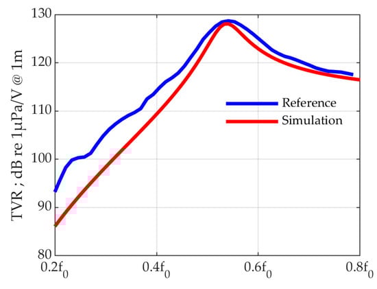 Prior to evaluating the characteristics of the designed transducer, the finite element analysis model of the transducer was compared with existing studies for validation (Table 1). The reference model was designed through an optimization process and manufactured so that the TVR is 0.9 dB smaller, and the bandwidth is similar [21]. Similar characteristics are calculated when comparing the model of this study and the reference model (Figure 9). The center frequency differs by 1.4%, the transmit sensitivity is 0.66 dB, and the FBW is 4.6% lower. In the case of the reference model, the above difference occurs because the coating for waterproofing was considered.