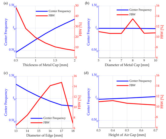The bandwidth of the transmitter affected the transient part of the transmitted wave. Therefore, a wide bandwidth is advantageous for reflectance control. Among the characteristics of the transmitting transducer, the center frequency should be fixed at the target frequency, but the bandwidth should be wide. It is the vibration of the metal that generates sound pressure in the cymbal transducer. Changes in the center frequency and bandwidth according to the parameters were analyzed using the FEM (Figure 10). Because the diameter was limited to half of the wavelength, the center frequency and fractional bandwidth (FBW) were calculated through frequency response analysis while sweeping , , , and . The greatest influence on the frequency is of the thickness of the metal cap and , i.e., the radius of the metal structure. In the case of , the center frequency increased proportionally with increasing thickness. However, in terms of bandwidth, a decrease in the thickness is noticeable. The radius of the metal structure is inversely proportional to the center frequency, and the bandwidth is wide for the measured values. In addition, determines the radius of the air layer. Therefore, the resonance of the air layer may appear during the analysis. The thickness of the air layer, , has little effect on the properties, and the top radius of the cap affects the bandwidth. Through the above process, the model with center frequency and the widest bandwidth is selected (Table 2, Figure 11). The specific bandwidth is 11.04%, and the center frequency is . Near , a change in sensitivity owing to the resonance of the air layer may also appear. The sensitivity at the center frequency is TVR 126.4 dB.