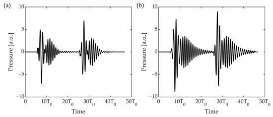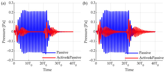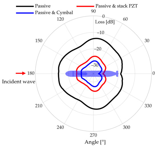 The A-scan measured at the receiver can be obtained by calculating the reflection in each mesh using Equation (1) (Figure 14). This is the result obtained by combining the reflections and active reflection control signals of active meshes when the incident angle is 45° and the reception angle is 45°. In other words, it is the sum of the data, such as that observed in Figure 12, according to the angle and distance. Blue lines appeared because of the application of only passive attenuation, excluding the active reflection control system. The black line is the result of applying the reflection coefficient according to the angle, attenuation of Rho-c, and attenuation according to the distance. An active reflection-control system using a cymbal transducer and stack PZT was applied (Figure 13). Based on RMS pressure, attenuations of 27.1 dB (cymbal) and 24.28 dB (stack PZT) occurred, respectively. When the reception angle changed, the active mesh and reflection coefficient also changed. By repeating this process, the peak result at 1–360° was obtained.