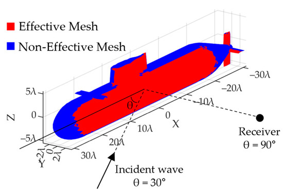 Meshed UUV model diagram. Effective mesh (red) and non-effective mesh (blue) according to angle of incidence and angle of reflection.
