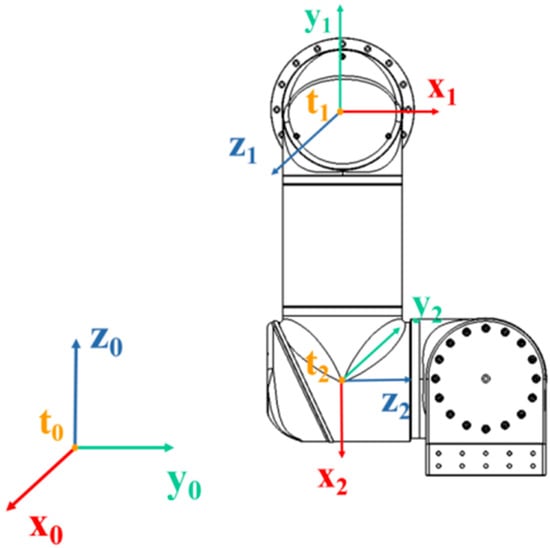 It should be noted that the four-manipulator system in this paper has only one base coordinate system, T0, while each manipulator has its own joint coordinate system, Ti (i > 0). We took RF as an example, and the base coordinate system T0 and RF joint coordinate system RF-T1, RF-T2 are shown in Figure 4. The D-H parameters of RF and LF are shown in Table 2.