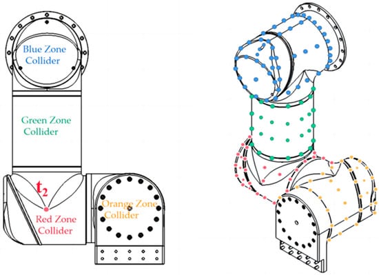 To improve the detection accuracy, we selected a certain number of points on the surface of each manipulator to envelop them. The selected points of each manipulator were accurately measured, calculated using the SolidWorks (version 2021) modeling software and confirmed on the actual robot. After the high-precision collider modeling of the manipulators, the distance calculation method based on the regular-shape collider cannot be used, and thus, we introduced the GJK algorithm. Since the GJK algorithm can only detect the collision relationship between convex shapes, as shown in Figure 5, each manipulator was divided into multiple convex colliders. All colliders of manipulators were established in their own T2 coordinate system.
